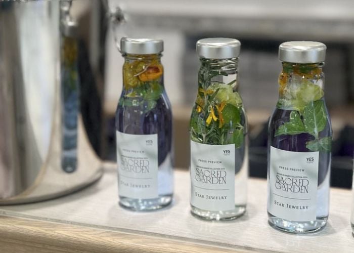 イベントに合わせて、ブルーベースのお色味に、華やかな黄色のエディブルフラワーを合わせたデトックスウォーターをオリジナルで作成いたしました。