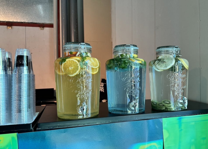 イベントに合わせて、イエロー・ブルー・クリアのお色味で3種類のデトックスウォーターをオリジナルで作成いたしました。